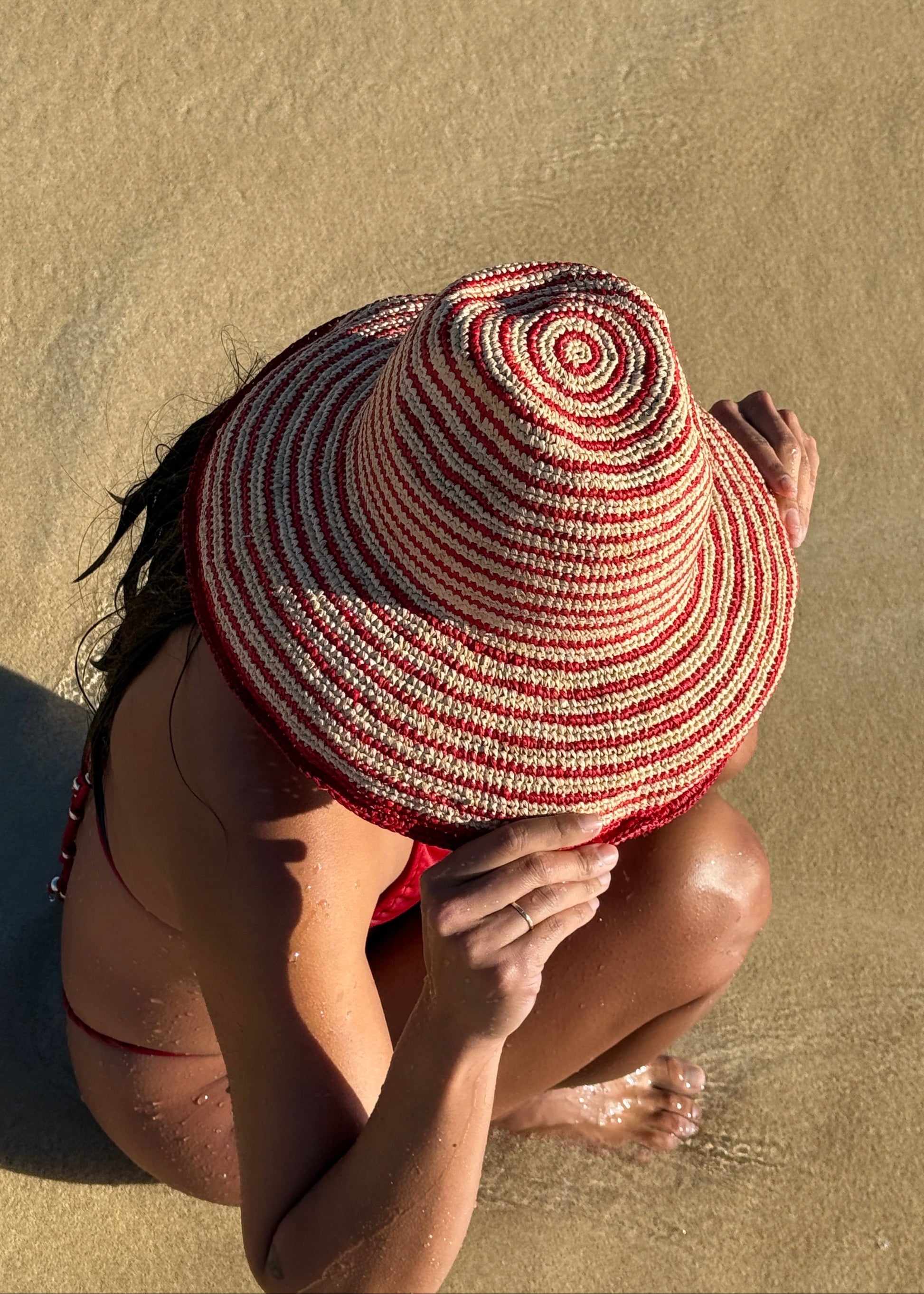 Crafted by local artisans, the SATROKO Raffia Fedora in Rouge features natural raffia with a red stripe dyed using eco-friendly pigments and a soft logo band lines the interior, offering both comfort and elevated style. Slight variations in color and design make each hat unique.