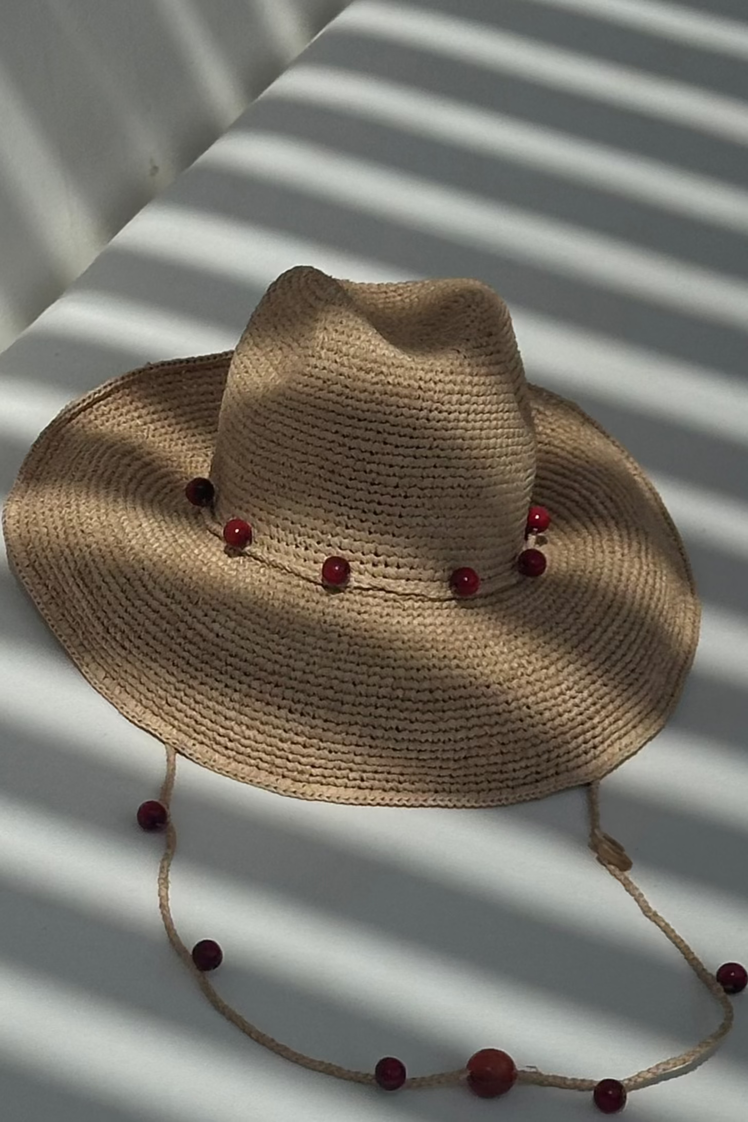 Elevate your summer style with this handwoven straw hat, featuring a wide brim and elegant red bead accents. Crafted from natural raffia from Madagascar, it offers breathable comfort and sun protection while adding a chic bohemian touch to your look. The decorative red beads around the crown perfect for beach days, garden parties, or festival vibes.